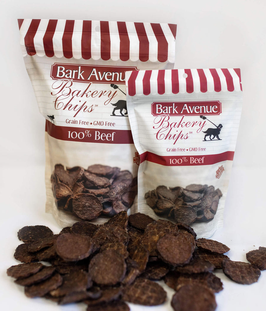 Bark Avenue Bakery Beef Chips are 100% USDA Beef. We use only the best hormone and GMO free beef available. We dehydrate them for hours to create a completely healthy, non fattening treat. Many of our customers say their furry friends just can't get enough of these addictive lil' nuggets!