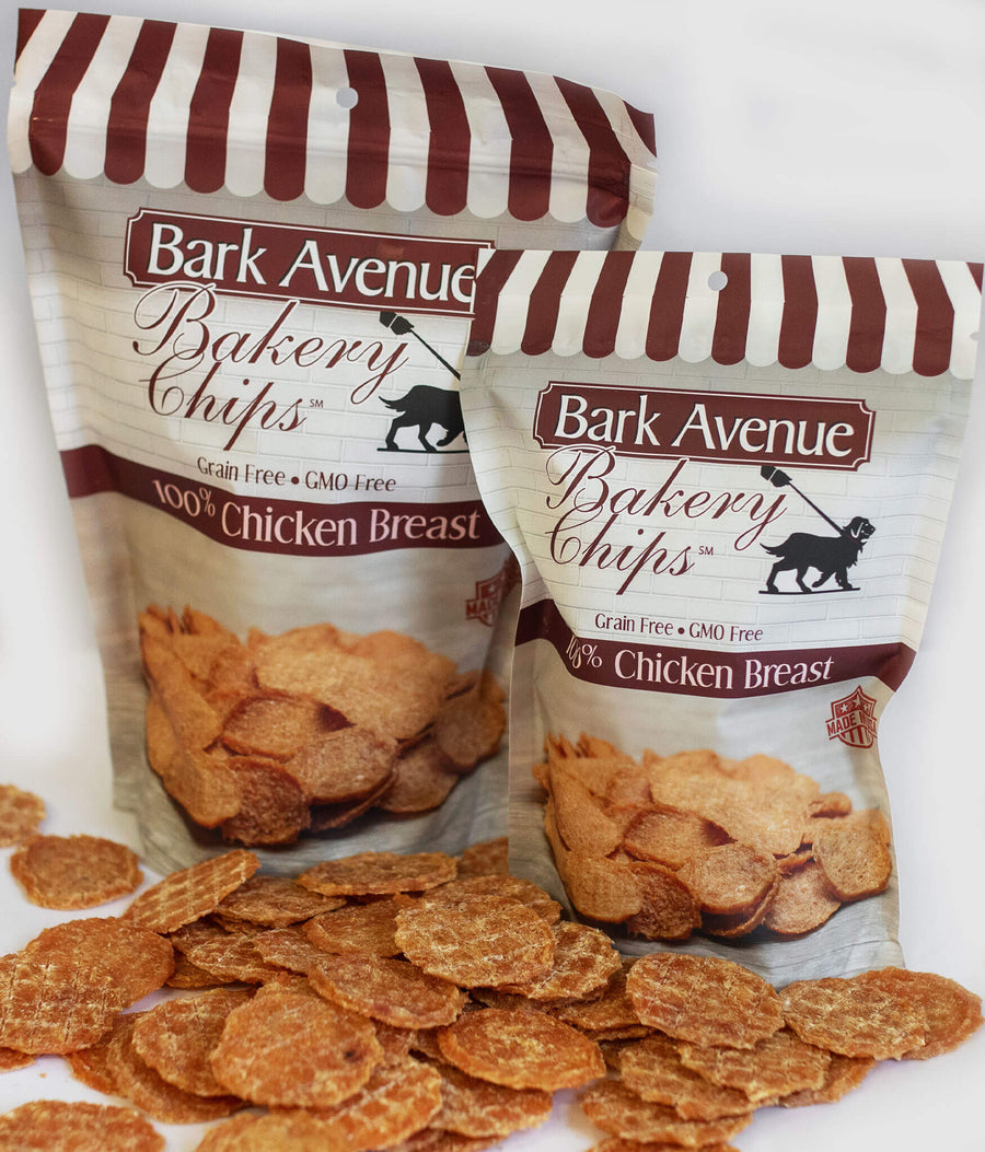 Bark Avenue Bakery Chips are 100% USDA Chicken Breast. We use only the best hormone and GMO free chicken available. We dehydrate them for hours to create a completely healthy, non fattening treat. Many of our customers say their furry friends just can't get enough of these addictive lil' nuggets!